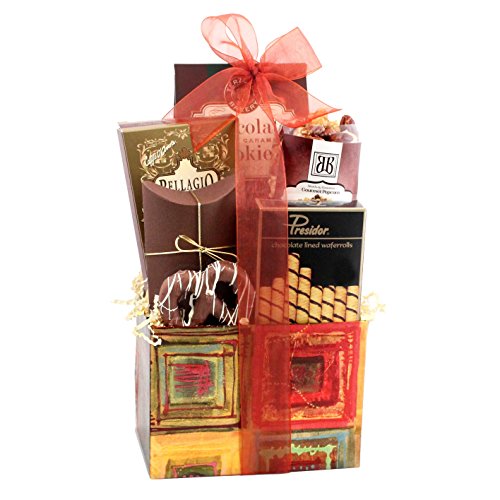 -. Feature : Great gift for birthday, thinking of you, or any occasion / Perfect gift basket for family and friends, or as a corporate office gift. / Gift basket includes: Gourmet Almond Pecan Popcorn (3.2oz), Chocolate Salted Caramel Cookies (2oz), Chocolate Covered Bavarian Pretzel (1pc), Soft Vanilla Caramels (5 Pcs.), Bellagio Milk Chocolate Hot Cocoa (1.25oz), Mini Wafer Rolls (1.25oz), Assorted Toffees (1.25oz) / GIFT BASKET DIMENSIONS: 7" x 5" x 9" high / Kosher Certified OK D. Giving a kosher gift ensures that all recipients can enjoy and partake in your gift.