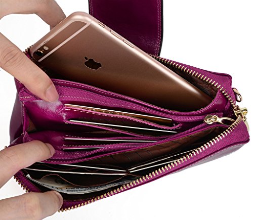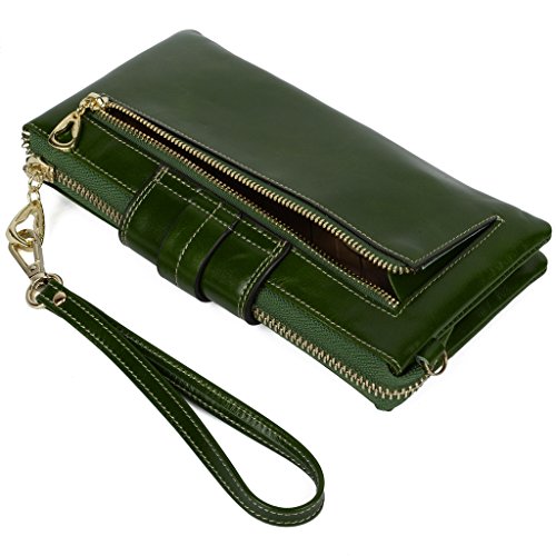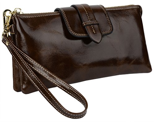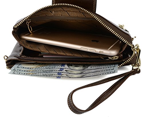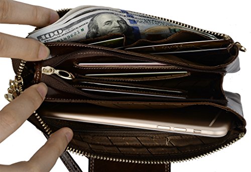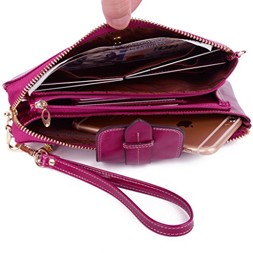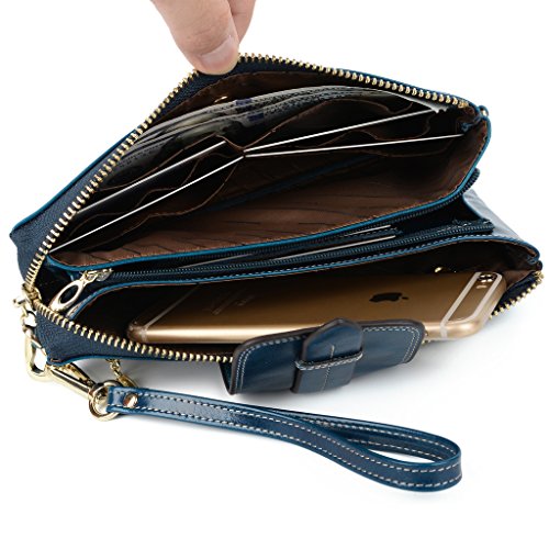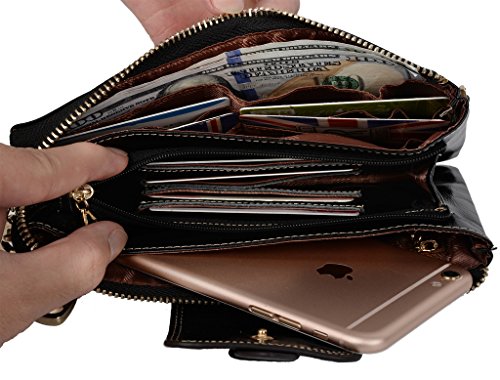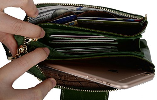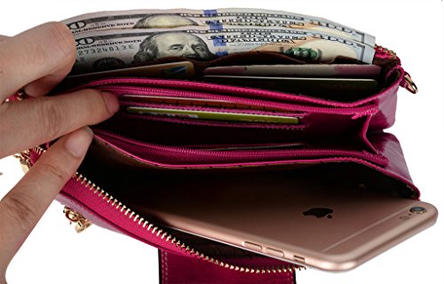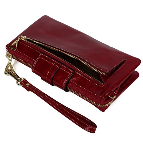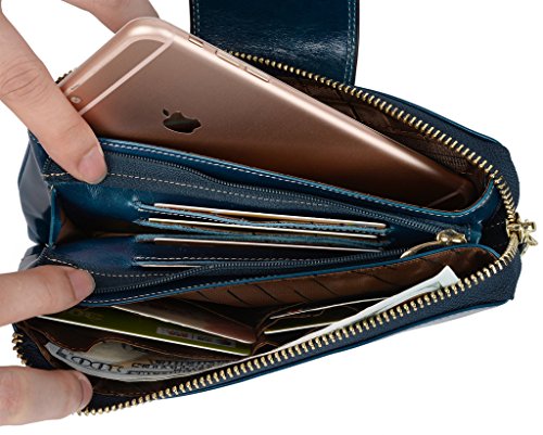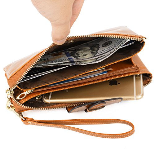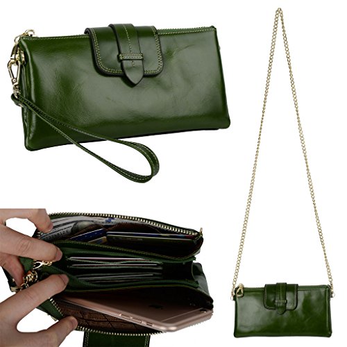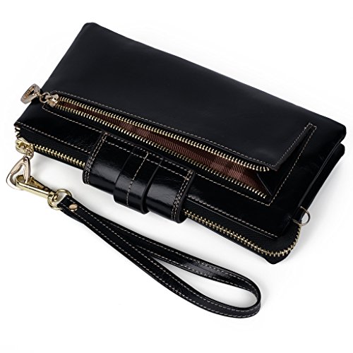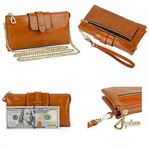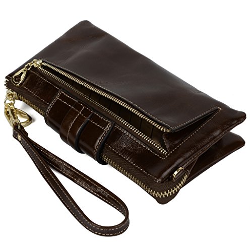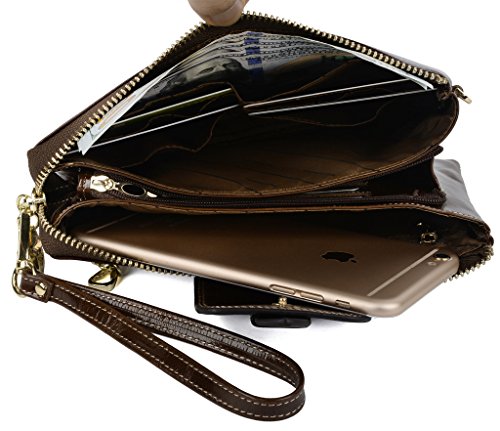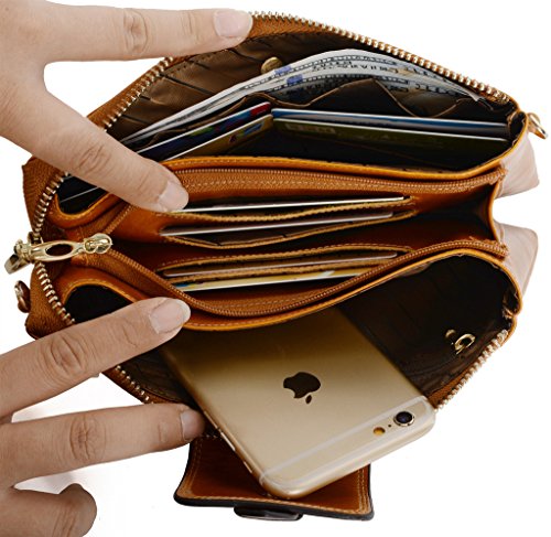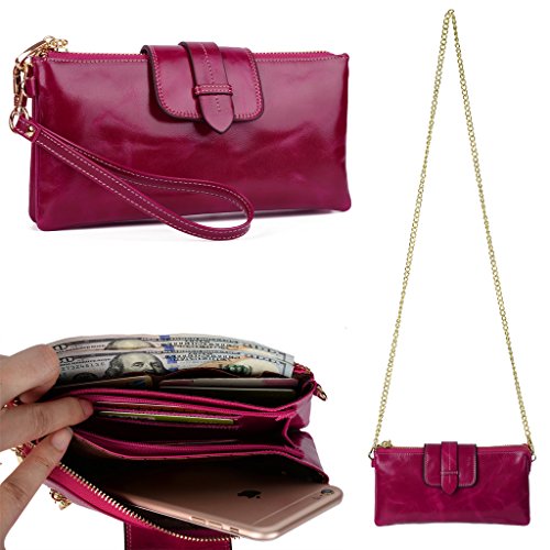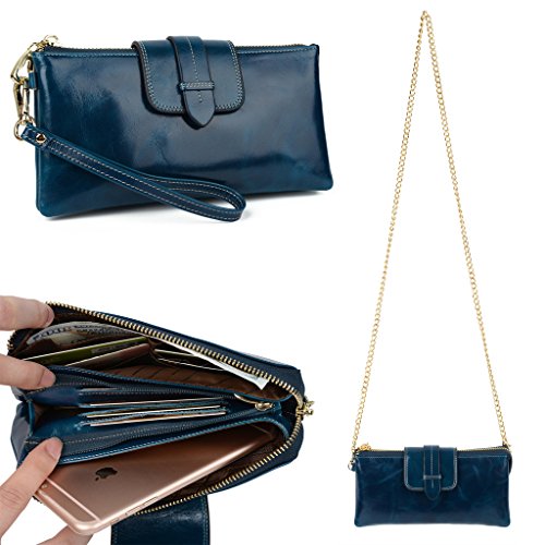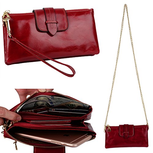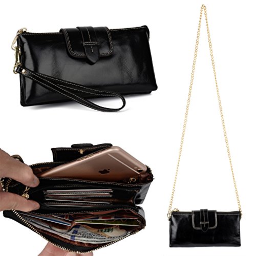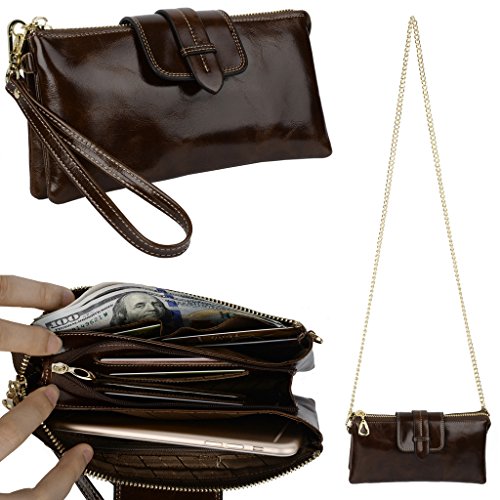 [Description] Soft Cowhide Leather with Oiling and Waxing Finish. 3 compartments with a wrist strap and a gold-color metal shoulder chain for multipurpose carry. Shiny gold-color hardware_ heavy duty zipper and detailed contrast stitching brightens up the wallet. 3 compartments and 8 card slots in totall.Fits IPhone 6 Plus_Samsung Galaxy S3/S4/S5/S6 and LG G3/G4 in the right compartment.Middle compartment contains 4 card slots. Triple compartments is designed for you to keep your cash_ cards_checkbook and smartphone oraganized well and easy to use. Dimensions: 7.87``L x 3.85``W x 1.18``H .The Weight is 0.57 pounds.