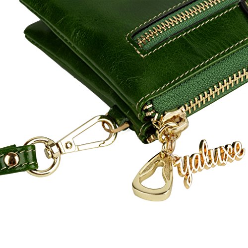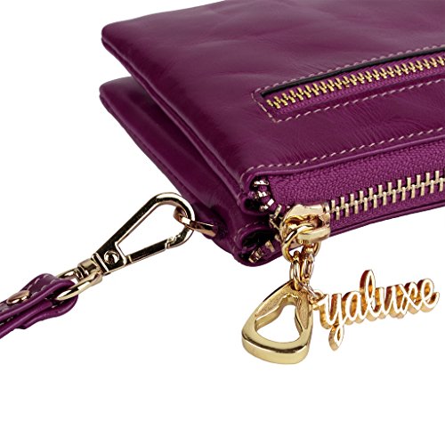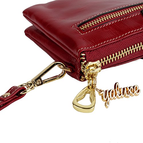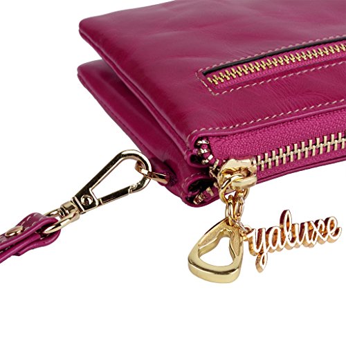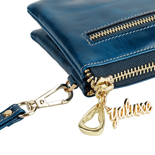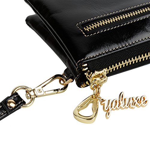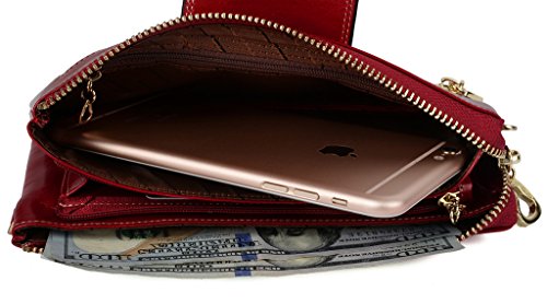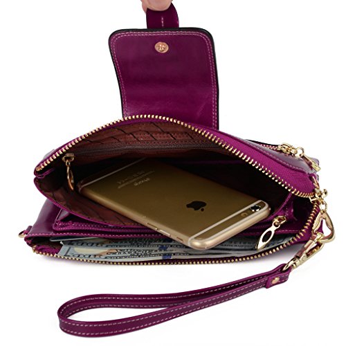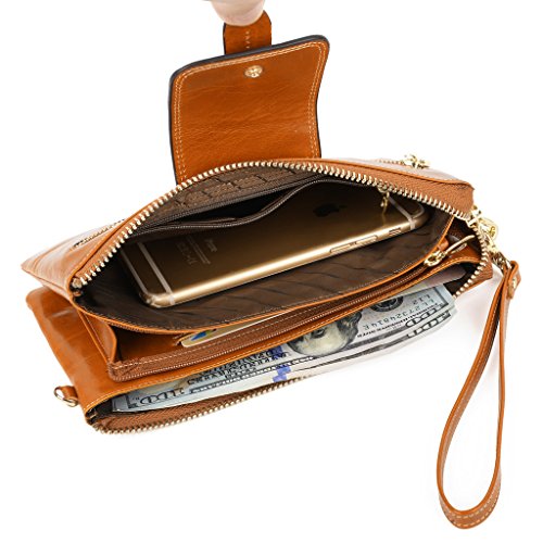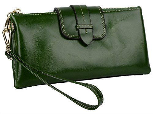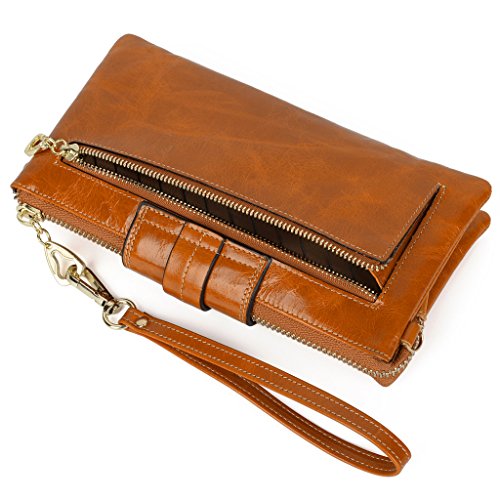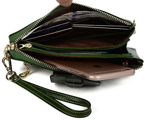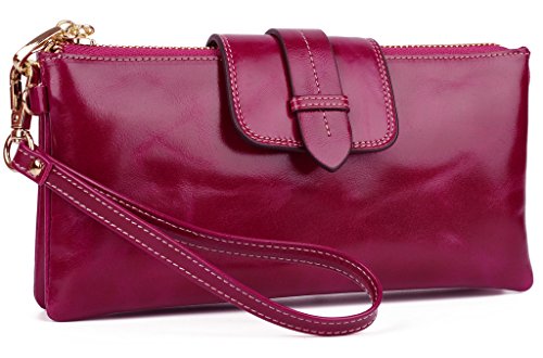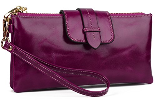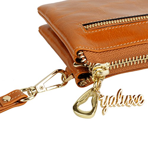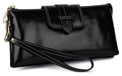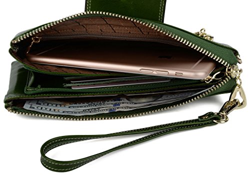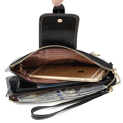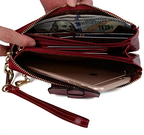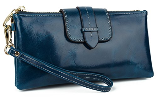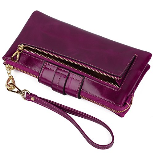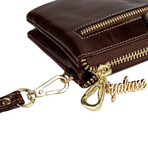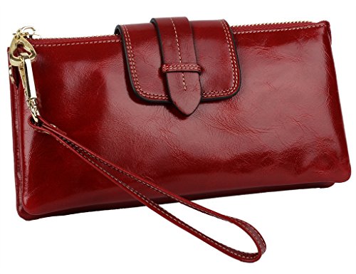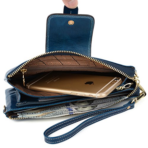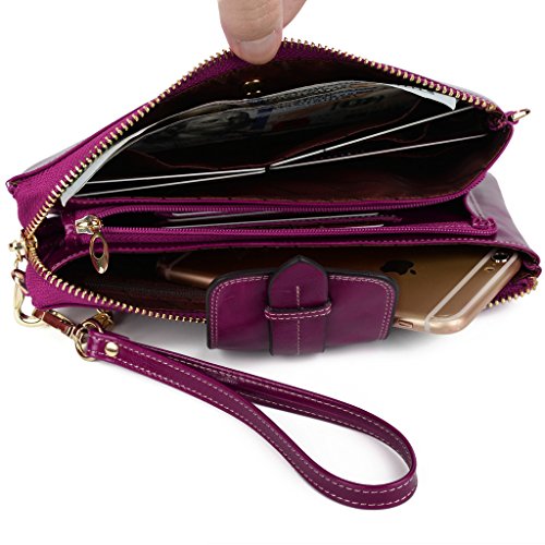 [Description] Soft Cowhide Leather with Oiling and Waxing Finish. 3 compartments with a wrist strap and a gold-color metal shoulder chain for multipurpose carry. Shiny gold-color hardware_ heavy duty zipper and detailed contrast stitching brightens up the wallet. 3 compartments and 8 card slots in totall.Fits IPhone 6 Plus_Samsung Galaxy S3/S4/S5/S6 and LG G3/G4 in the right compartment.Middle compartment contains 4 card slots. Triple compartments is designed for you to keep your cash_ cards_checkbook and smartphone oraganized well and easy to use. Dimensions: 7.87``L x 3.85``W x 1.18``H .The Weight is 0.57 pounds.