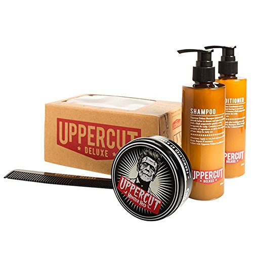 This kit contains Uppercut Deluxe Monster Hold Pomade 2.5oz, Uppercut Deluxe Shampoo 250ml, Uppercut Deluxe Conditioner 250ml, and a Uppercut Deluxe Black Pocket Comb