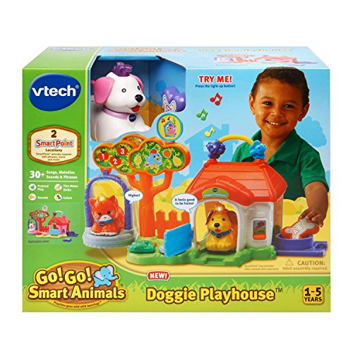 -. Feature : Explore this online exclusive Doggie Playhouse for girls, ride on the swing and search for buried treasure; Dotty the Dog teaches the letter D and the name of the animal through pretend play / SmartPoint Labrador responds to two SmartPoint locations with different phrases, music or fun sound effects; 30+ songs, melodies, sounds and phrases / Build motor skills by sliding the spinning beads, pushing the dog on the swing and searching for buried treasure in the yard / For even more fun, add other Go! Go! Smart Animals (sold separately) to the Doggie Playhouse / Works with Go! Go! Smart Animals, Go! Go! Smart Wheels and select Go! Go! Smart Friends playsets (each sold separately). Included SmartPoint Labrador requires 2 AAA batteries (included for demo purposes only; new batteries recommended for regular use); intended for ages 1 to 5 years