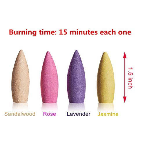 - ►Packaging content: 72PCS incense cones contains 18* Rose incense, 18* Osmanthus incense, 18* Jasmine incense, 18* Lavender incense, 18* Sandalwood