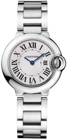 Stainless steel case with a stainless steel link bracelet. Fixed stainless steel bezel. Silver opaline dial with blued steel hands and black Roman numeral hour hour markers. Minute markers on an inner ring. Battery operated Swiss quartz movement. Scratch resistant anti-reflective sapphire crystal. Fluted crown set with synthetic cabochon. Solid case back. Case diameter: 28 mm. Case thickness: 9.5 mm. Deployment clasp. Water resistant at 30 meters / 100 feet. Functions: hours, minutes. Cartier Ballon Bleu de Cartier Ladies Watch W69010Z4.