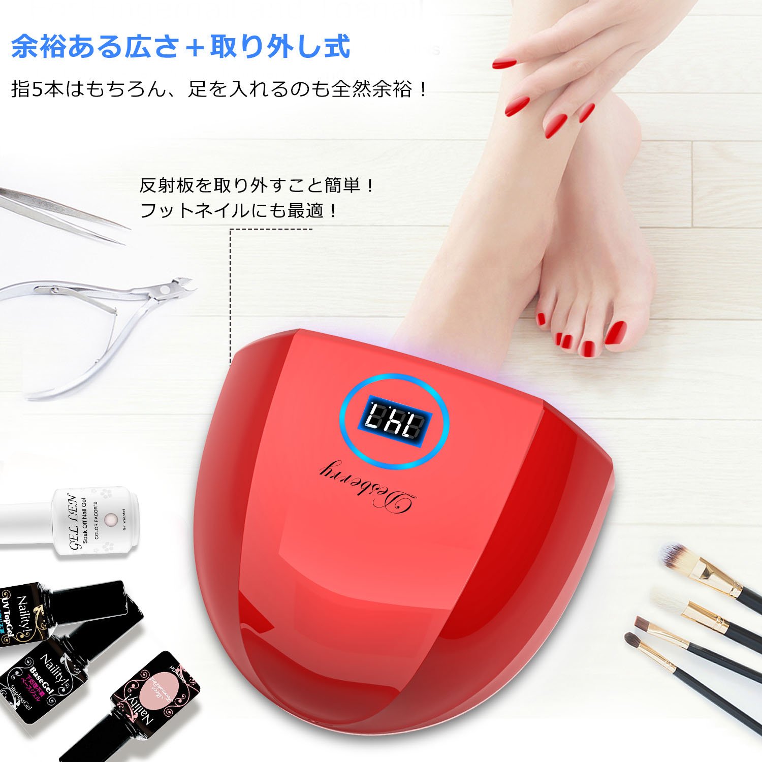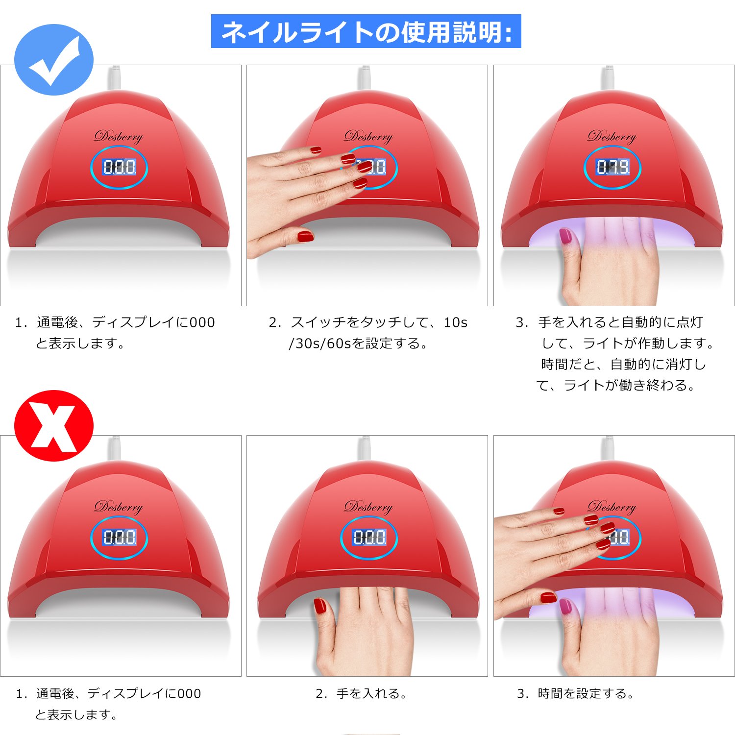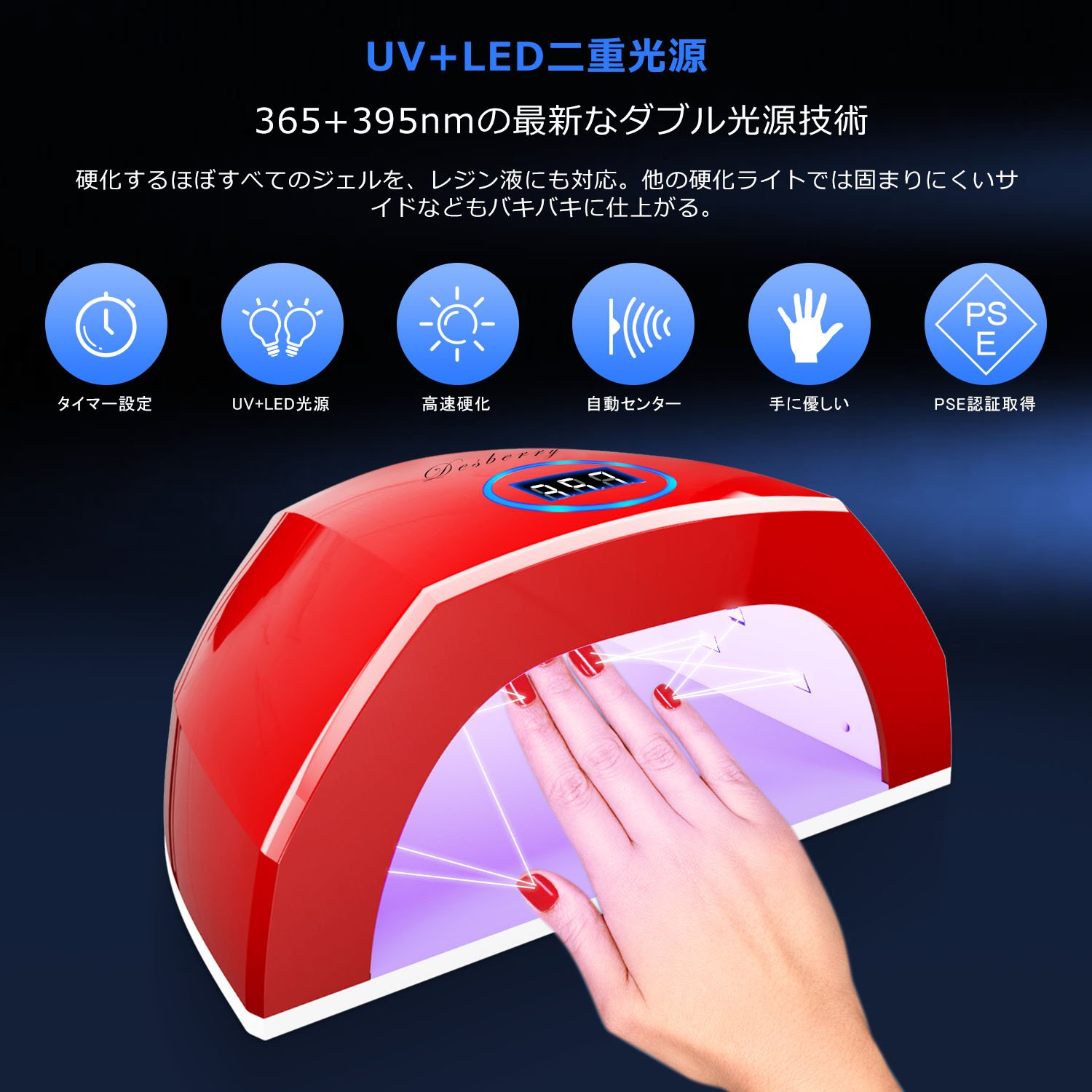 【超高速硬化】最速ダブル光源技術を採用するネイルドライヤーは48Wでハイパワーで、従来の品よりもムラなく素早く硬化できます。ネイルランプの光源の使用寿命も約50000時間に達します。肌に負担の多いCCFLは使用していませんが、人体に優しいLED(30pcs)の光を使用して皮膚の損傷を生じるし、手足に黒くになることは全然ないです。安心してお使いください。