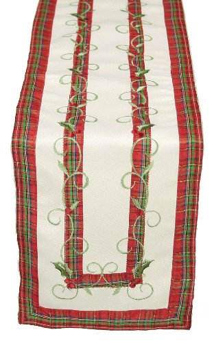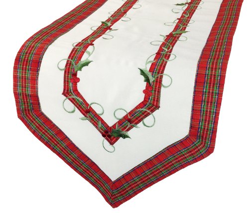 Xia Home Fashions Tartan Ribbon Embroidered Christmas Table Runner, 16 by 34-Inch, White