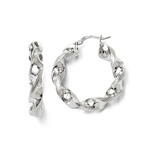 Traditional yet distinctive, a hollow round hoop measuring 5.7mm in width by 31mm (1 3/16 inch) in diameter featuring a polished and textured twist design. They are fashioned from sterling silver and finished with snap-tight hinged posts that are comfortable and secure. Made in ItalyFeature