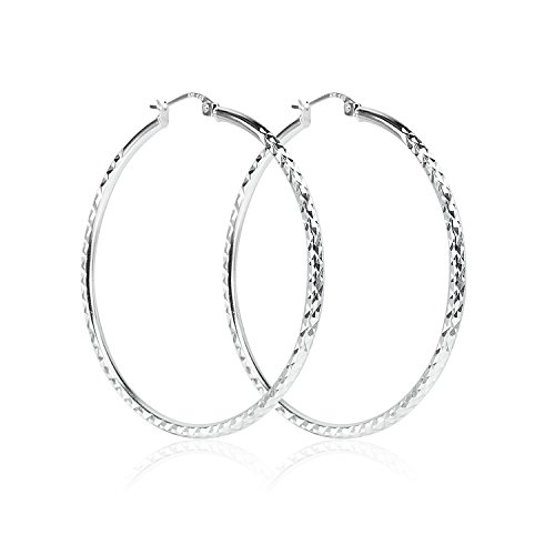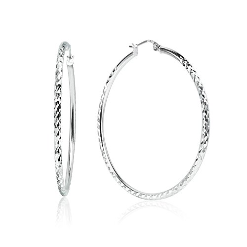 High polished earrings display diamond-cut textured round hoops with click-top closures. Choose the diameter size that suits you style. The hoops are crafted of sterling silver and are nickel free.