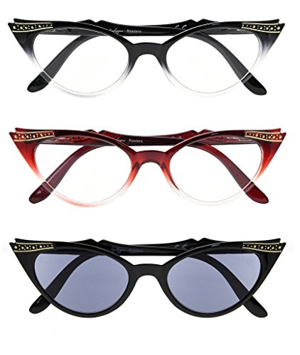 Eyekepper Womens 3 Pairs Reading Glasses Ladies' Vintage Cat Eye Readers, Include Sun Readers (Black Transparent/Red Transparent/Grey Lens, +0.75)