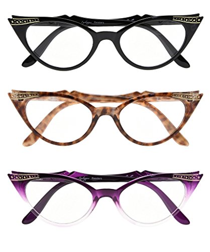 Eyekepper Womens 3 Pairs Reading Glasses Ladies' Vintage Cat Eye Readers (Black/Tortoise/Purple Transparent, +1.50)