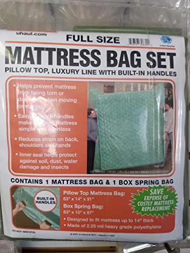 -. Brand : UHaul -. Color : Green -. EAN : 0616797306302 -. Feature : Easy to grasp handles make carrying mattress simple and effortless Helps prevent mattress from being torn or damaged when moving or storing Reduces strain on back, shoulders, and hands -. Label : Uhaul -. Manufacturer : Uhaul -. Model : mbqcp -. MPN : mbqcp -. PackageQuantity : 2 -. PartNumber : mbqcp -. ProductGroup : Home -. ProductTypeName : HOME_BED_AND_BATH -. Publisher : Uhaul -. Size : 14" deep -. Studio : Uhaul -. Title : Uhaul Full Mattress Bag Set with Built-in Handles -. UPC : 616797306302
