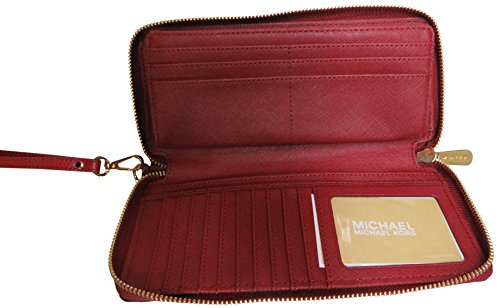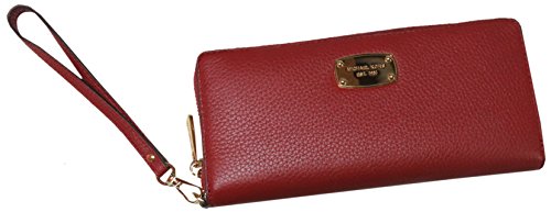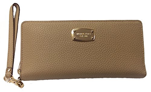 Binding : Apparel Product Description Spacious travel wallet wrapped in beautiful pebbled leather and polished hardware. The front is accented with Michael Kors logo nameplate which has been updated for 2015 with an elevated profile and rounded corners. This zip around style wallet has a leather and signature fabric interior that features (16) card slots, a clear ID slot, (6) full length bill compartments and a zippered coin compartment. It has a removable wristlet strap and measures approximately 8.25" (L) x 3.75" (H) x 1.25" (W). 0