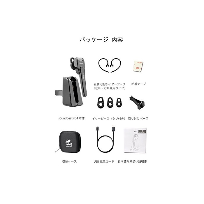 ●D4 Bluetooth 헤드 세트 본체●전용 충전기(cradle)●충전용microUSB케이블●carrying 케이스●이어 훅×2●이어 피스(S,M,L의 3사이즈)●취급 설명서(일본어) 【대응 기종】Bluetooth(블루 tooth)탑재 디바이스로 대응.Apple iPhoneX/iPhone8/iPhone8 Plus/iPhone7/iPhone7 Plus/iPhone SE/iPhone6s/iPhone6s Plus/iPhone6 등iPhone각 기종,iPad Pro/iPad Air/iPad mini등iPad각 기종,iPod각 기종,Sony Xpeira,Google Nexus,Samsung Galaxy,Asus,Fujitsu,Huawei등Android각 기종,Windows,Mac탑재PC등.