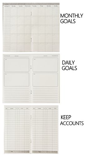 Refillable paper: 4 inserts (1 monthly goals, 2 daily goals and 1 accounting). 64pages/insert*4 inserts=256pages.It’s thick enough to record your daily life. The acid-free papers help you write more fluently. It’s suitable for all kinds of pens.