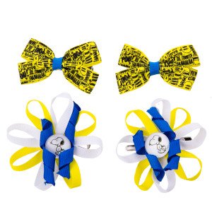 -. Binding : Misc. -. Brand : Peanuts -. Color : Blue and Yellow -. EAN : 0737257652392 -. Feature : 100% Grosgrain Ribbon Exclusive of Decoration / Hand wash cold water / Use only under close supervision -. Label : Apparel for Dogs -. LegalDisclaimer : Use under close supervision only. -. Manufacturer : Apparel for Dogs -. PackageQuantity : 1 -. ProductGroup : Pet Products -. ProductTypeName : PET_SUPPLIES -. Publisher : Apparel for Dogs -. Studio : Apparel for Dogs -. Title : Snoopy Dog Hair Bows - 2 Pair -. UPC : 737257652392