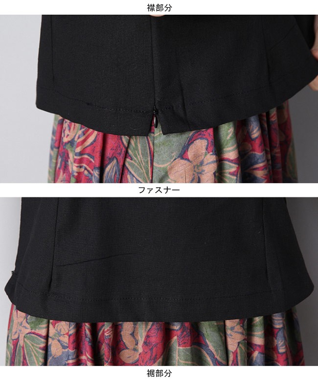 シンプルな無地の黒に襟部分だけ花柄に切り替え、ちょうどいい程度の華やかさでアクセントを付ける