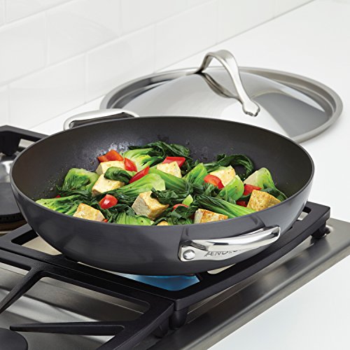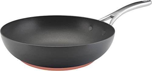 Prepare Asian favorites and other gourmet dishes using this ample Anolon Nouvelle Copper Hard-Anodized Nonstick 12-Inch Covered Wok. Its European-inspired design boasts a graceful flair and the pleasing and subtly contrasting colors add luxury to any contemporary kitchen. Anolon Nouvelle Copper boasts durable, hard-anodized construction crafted with copper to deliver optimum heat control when wilting baby spinach with garlic. A double full cap base includes a copper core layered between aluminum and magnetized stainless steel, making it compatible with all cooktops, even induction. PFOA-free and restaurant-tested DuPont Autograph 2 nonstick is metal utensil safe and delivers long-lasting food release for stir-fried honey ginger chicken and broccoli - and cleaning the wok afterward is easy. The wok features generously appointed cast stainless steel handles that are attached to the pan using innovative flat-rivet technology and the stainless steel lid locks in heat and moisture. Oven safe to 500 and built on a tradition of high quality and high performance, this elegant covered wok is an ideal complement to many other items in the Anolon collections.Feature