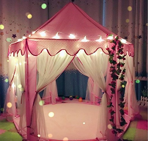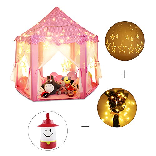 DIMENSION: Tent 55" (Diameter) x 53" (H) Specially designed hexagon, provide a perfectly sized space, giving your children plenty of room to stand and play, even an adult can fit inside. Includes 6miles 40* small star light aroung the top of playtent,12 hang middle and large star light use AAA batteries for them, super safe warm soft pink Mat under the Tent,a little smile light Hang in your Tent inside,Let the child have a wonderful night Playing dress-up, have fun with friends, or read, etc.