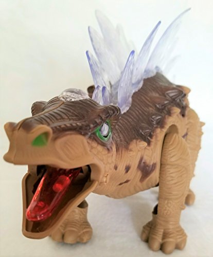 Colorful light up stegosaurus dinosaur with realistic dinosaur sounds. Interactive moving dinosaur. Batteries not included. Requires three (3) AA batteries.