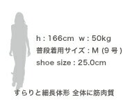 | モデル | 身長:158cm 洋服のサイズ:S~M(7~9号) 足のサイズ:24.0~24.5cm モデル着用サイズ:M |