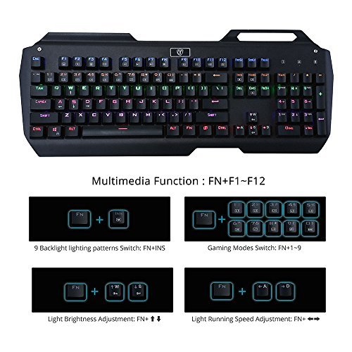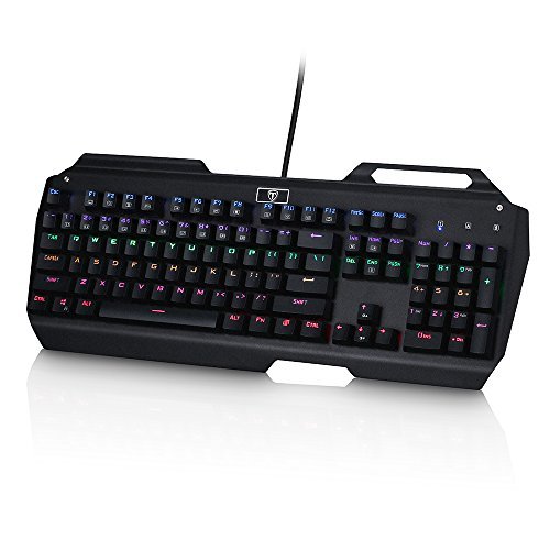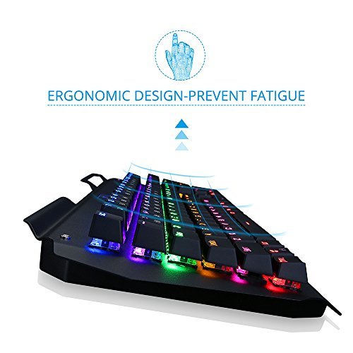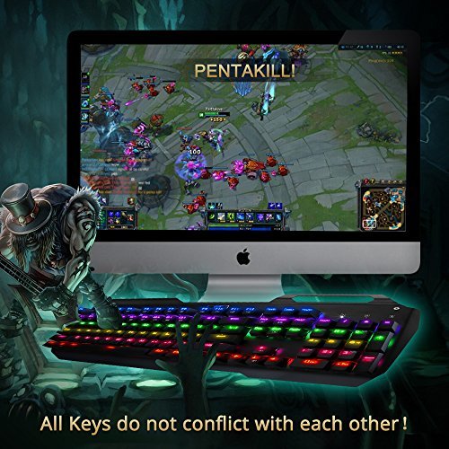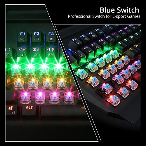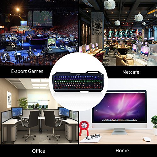 -. Feature : ANTI-GHOSTING TECHNOLOGY. "Ghosting" is the problem that some keys don't work when multiple keys are pressed simultaneously. This mechanical gaming keyboard adopts anti-ghosting technology that each key is controlled by independent switch. / MULTI-COLOR ADJUSTABLE LED BACKLIGHT. The LED backlight adds fantastic ambience when you play games. There are 9 predefined lighting patterns and 8 game lighting modes. You can also define a lighting pattern at your will. / KEYCLICK KEYBOARD: SENSITIVE AND RESPONSIVE. Easy to press and fast response, and you don't have to press the keys with great force. The clicky sound is pleasant, The characters which are integrated into the keys will never fade. / ADVANCED ECO-FRIENDLY MATERIAL. Made of top-graded ABS and metal material, with matte-finish texture. Moreover, because the keyboard has three drain holes. It is a water-resistant keyboard. / WIDE COMPATABILITY. This keyboard is suitable for most computer system including Windows10,Windows 8, Windows 7, Mac OS X, Windows XP, Windows VISTA and so on. (A key cap puller tool is offered for free if you buy our keyboard !)