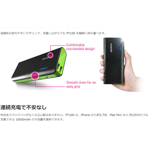 ●PT100 は、iPhone なら約3.7回、iPad Mini なら 約1回分のフル充電できる 10000mAh の大容量を提供できます。