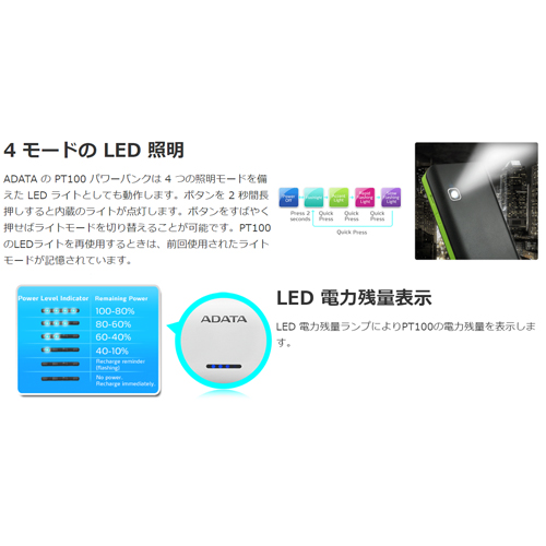 ●ADATA の PT100 パワーバンクは 4 つの照明モードを備えた LED ライトとしても動作します。