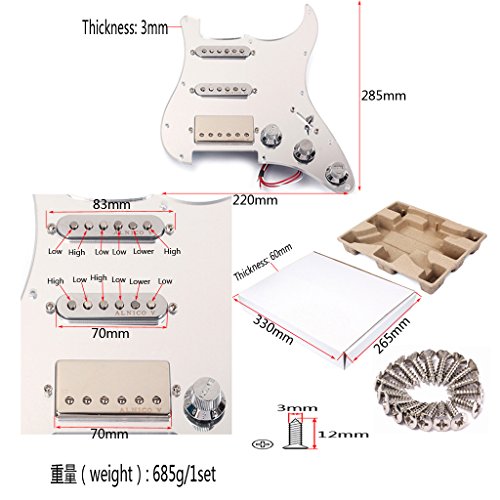 Description: - Perfect for players who need accurate traditional single-coil tone, especially with clean and mildly distorted amp settings. - The Pickguard is fit for Fender Strat ST Electric Guitar - High quality and testing is fine.Medium frequency full,The output power,Sound reduction sensitivity - Material:acrylic copper - Size:33x26.5x6cm/13x10.4x2.36inch. Specification: - Neck Alnico 5 single Pickup R :7.6-8k - Middle Alnico 5 single Pickup R: 10K - Bridge Alnico 5 humburker Pickup R:12K Package Includes: 1 piece loaded pickguard 12 pieces screws Note: Please pay attention to the pickguard size before placing an order in case of unfitness, thank you! 0 |