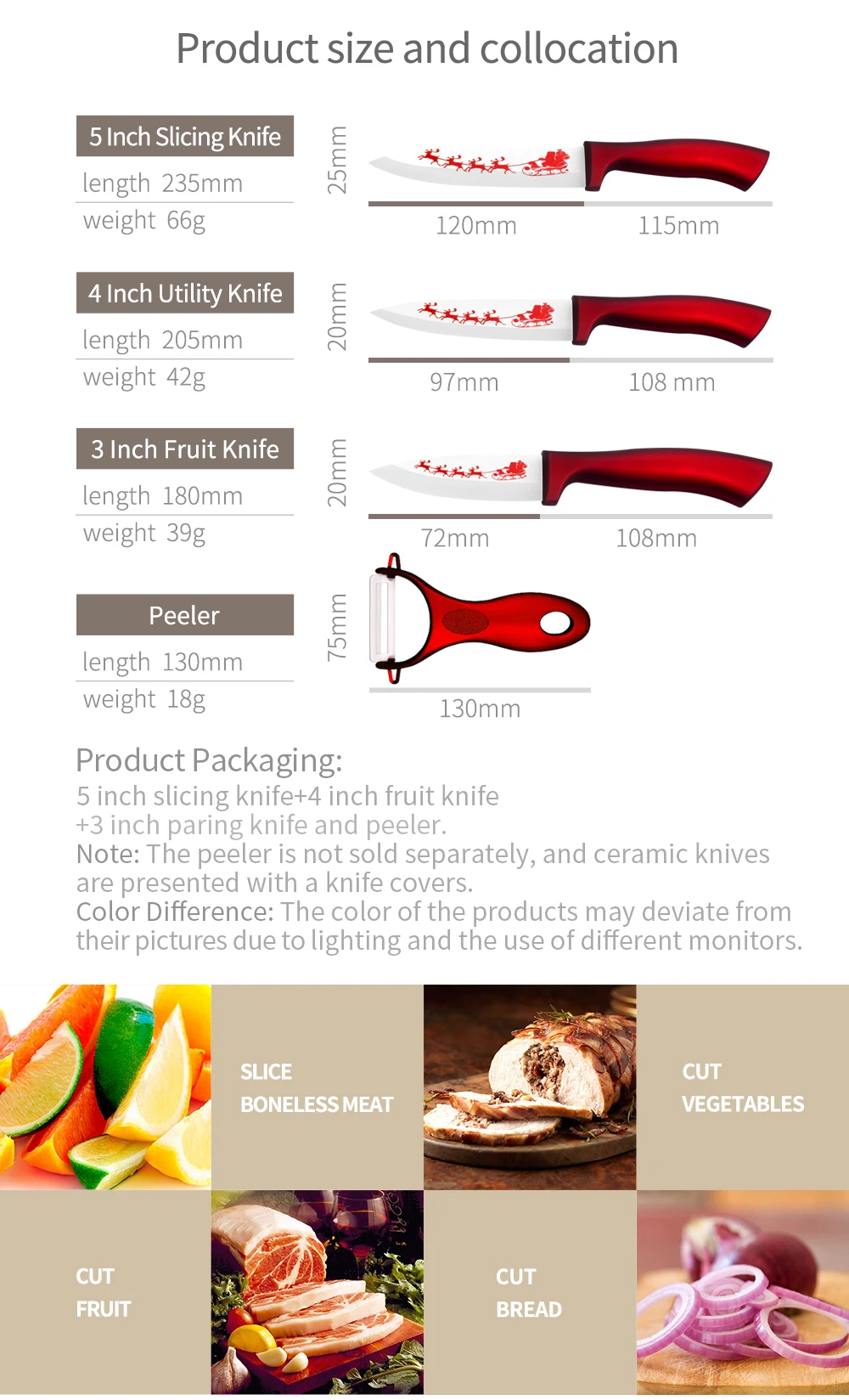 Packaging Includes:3" Paring 4" Utility 5"Slicing Knife&Peeler