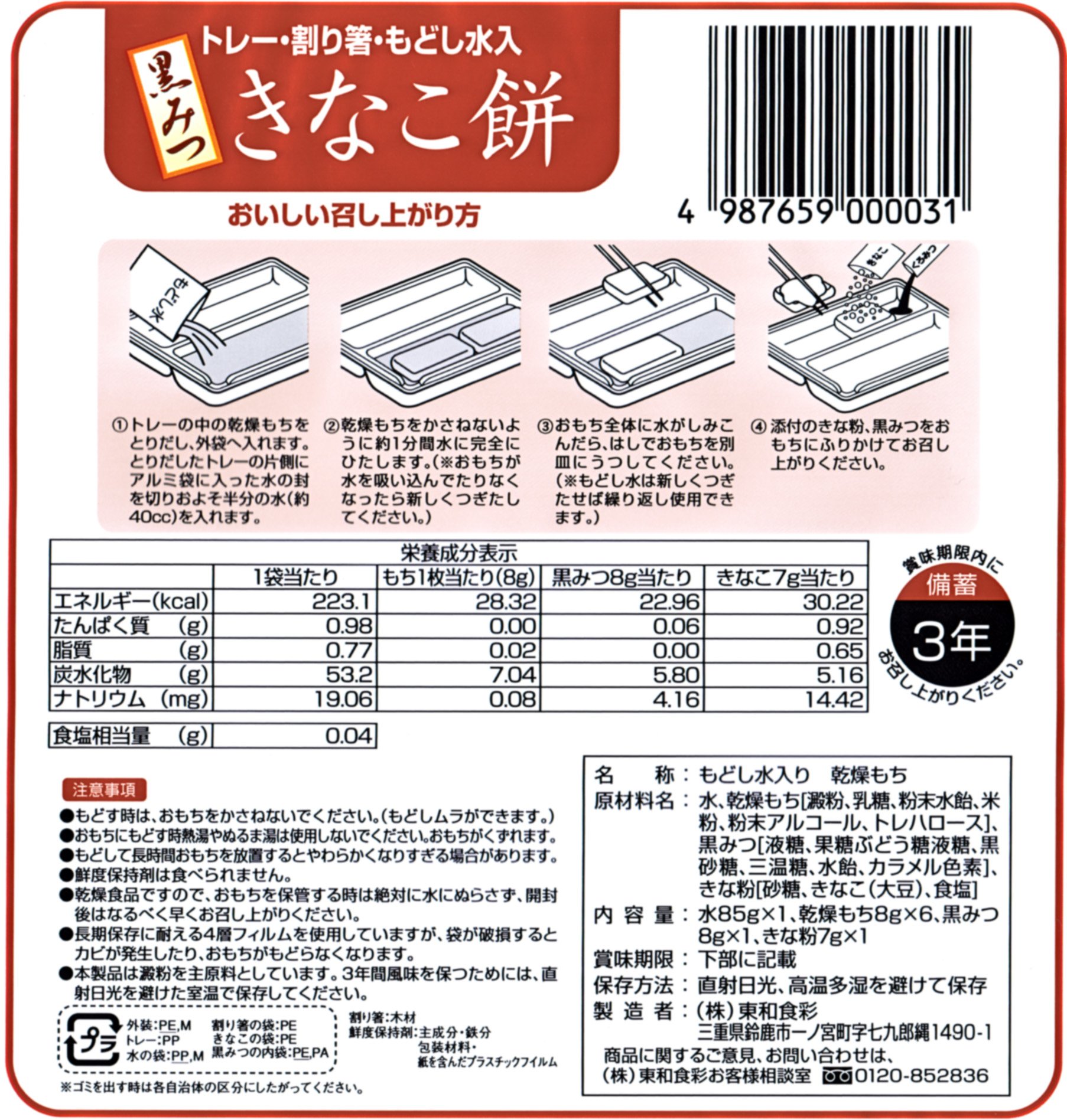 In the aluminum bag, there are exclusive plastic trays and disposable chopsticks, preservation water for reconstitution, 6 pieces of drying moisture and black mats and kimako in each bag.