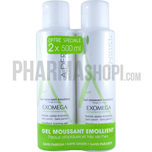 - Aderma Exomega Emollient Foaming Gel 2 x 500ml with Rhealba Oat Plantules cleanses, soothes and protects the atopic and very dry skins.