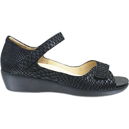 Studio : Ziera Publisher : Ziera Binding : Apparel Product Description The Ziera Genie is a casual women's backstrap sandal with two adjustable hook and loop straps and a removable footbed so you can add your own custom orthotics. These Ziera Genie Black Exotic Snake Suede Women's Sandals have the following features: Get an individual fit and increased support with straps that help keep your foot in place for the perfect fit Contouring at the heel cradles your foot and supports the metatarsal and the inner and outer longitudinal arches for maximum underfoot comfort Softest cow leather lining that over time will mould to your foot no matter what your foot shape giving maximum comfort Lightweight shoe that feels light on the foot Removable footbeds which you can swap out for your custom orthotic Soft and supple leather molds to your foot for luxurious comfort, 13 different laboratory tests ensure that it's super soft yet tough enough for every day wear Millions of tiny cushioning air bubbles underfoot so you'll feel like you're walking on air Contoured and cushioned footbed with xmm memory foam offering the ultimate in comfort and support 0