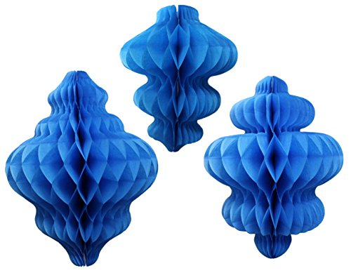 Studio : Devra Party Publisher : Devra Party Binding : Kitchen Product Description Set of 3 honeycomb tissue paper hanging ornament decorations in turquoise blue. The pack includes three hanging honeycomb decorations in different vintage inspired styles: one 11 inch hanging lantern shaped decoration, one 10 inch chandelier shaped decoration, and one 8 inch ornament with a spinning top design. The decorations ship flat and come with an attached hanging string and sticky tape to keep the decorations open. Made in the USA by Devra Party. 0