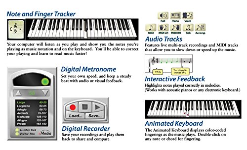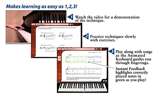 eMedia Beginner Piano and Keyboard Lessons is the unique solution that provides everything you need to begin learning to play. Learning is made easy through over 75 step-by-step lessons ranging from hand position to note reading, tempo, dynamics and more. Full-motion videos with an on-screen teacher give life to the lessons, and an animated keyboard guides you through fingering for the songs and exercises. Interactive review and ear training screens help reinforce new concepts, and colorful accompaniments make practicing fun! When used with a MIDI-compatible keyboard, there’s even interactive feedback on wrong notes and rhythms.Feature