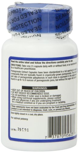 -. Binding : Health and Beauty -. Brand : Life Extension -. EAN : 0737870956037 -. Feature : One of nature's most powerful antioxidants / Most bioavailable fruit extract of its kind / Each capsule contains the equivalent polyphenol content of 30 pomegranates / Highly effective suppression of free radicals -. IsAdultProduct : 0 -. Label : Life Extension -. LegalDisclaimer : * These statements have not been evaluated by the Food and Drug Administration. This product is not intended to diagnose, treat, cure or prevent any disease. **Always refer to the manufacturer's label on the product for description, recommended dose and precautions. -. Manufacturer : Life Extension -. Model : 737870956037 -. MPN : 00956 -. NumberOfItems : 1 -. PackageQuantity : 1 -. PartNumber : 00956 -. ProductGroup : Health and Beauty -. ProductTypeName : HEALTH_PERSONAL_CARE -. PublicationDate : 2011-01-12 -. Publisher : Life Extension -. Size : 30 -. Studio : Life Extension -. Title : Life Extension Pomegranate Extract, 30 vegetarian capsules -. UPC : 737870956037
