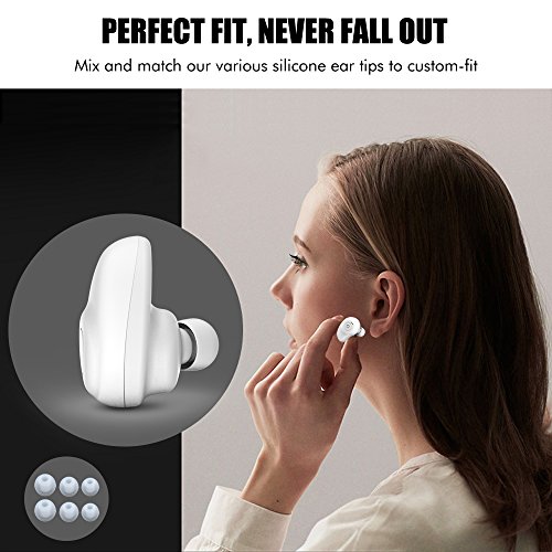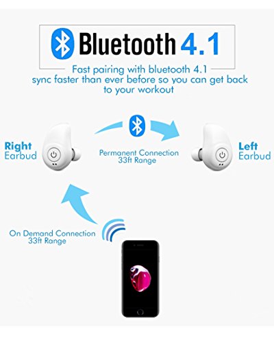 -. Feature : TRULY WIRELESS BLUETOOTH HEADSET, NEW TRENDS IN FUTURE: No cable, just two earpieces insert into your ears, Precision engineered truly wireless smart earphones with an extraordinary high definition Audio quality, perfect for workout, running, gym, walking and other activities, compatible with all bluetooth devices includes iPhone 7 / BLUETOOTH 4.1: Latest Bluetooth technology used in all of our products with the most advanced wireless connection, aptX supported to bring you the clearest CD-like audio quality / WIRELESS CHARGING CASE: Don't need pled into an outlet or computer to charge them, the portable wireless charging case delivers 2 hours listening time on one charge, thanks to a charging case that holds multiple additional charges for more than 48 hours of listening time, giving you power for a full day of true wireless audio, 30 minutes quick full charge in the case / WIRELESS MUSIC PLAY AND HANDS-FREE PHONE CALLS: With fast, stable and reliable wireless transmission, up to 33 ft long distance connecting. Compatible with almost all the bluetooth devices to play music and to answer hands-free phone calls / ERGONOMICS CUSTOMIZE FOR THE PERFECT FIT : Designed to fit securely and comfortably in your ear, giving you the unlimited freedom of movement you deserve. Mix and match our various silicone ear tips to custom-fit your ears so they'll never fall out or feel unnatural