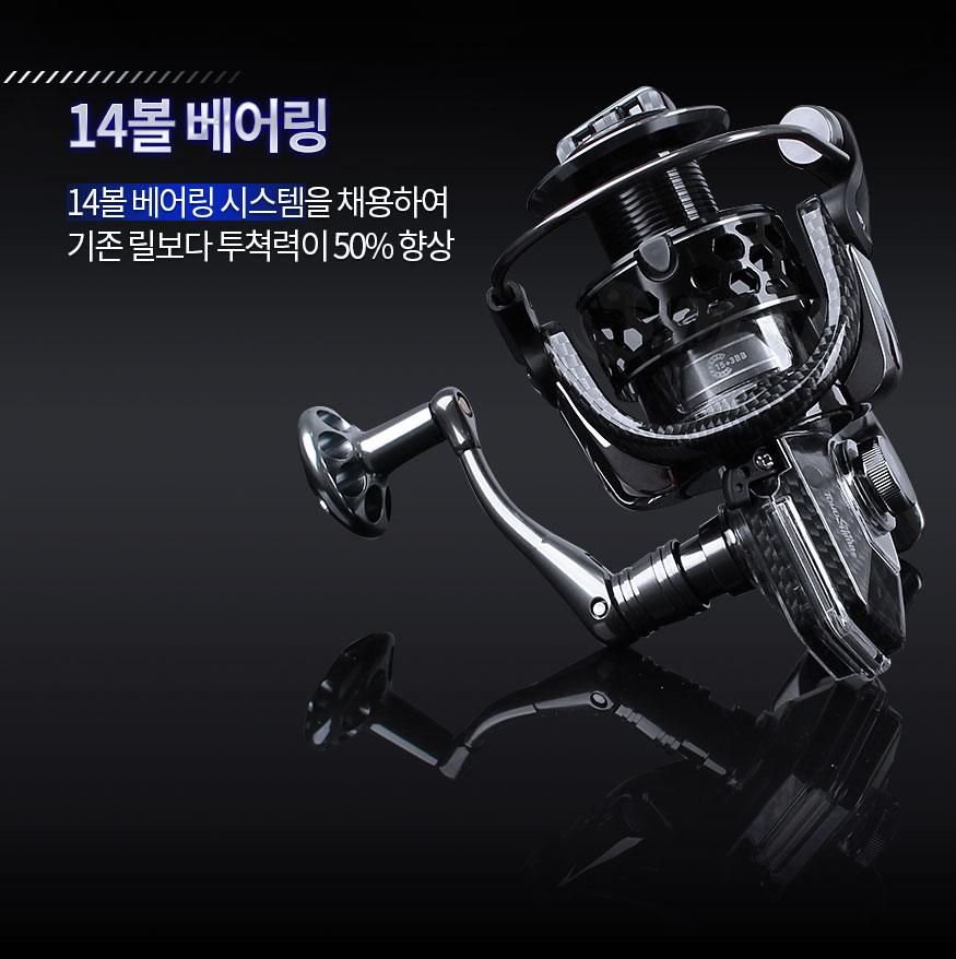 일반적인 릴과 다르다..내구성강한 스텐레스 14볼베어링-->너무나 부드럽고 강한 힘으로 미터급 부시리도 개끌리듯.. 끌려와 한층더 낚시가 즐겁다!!