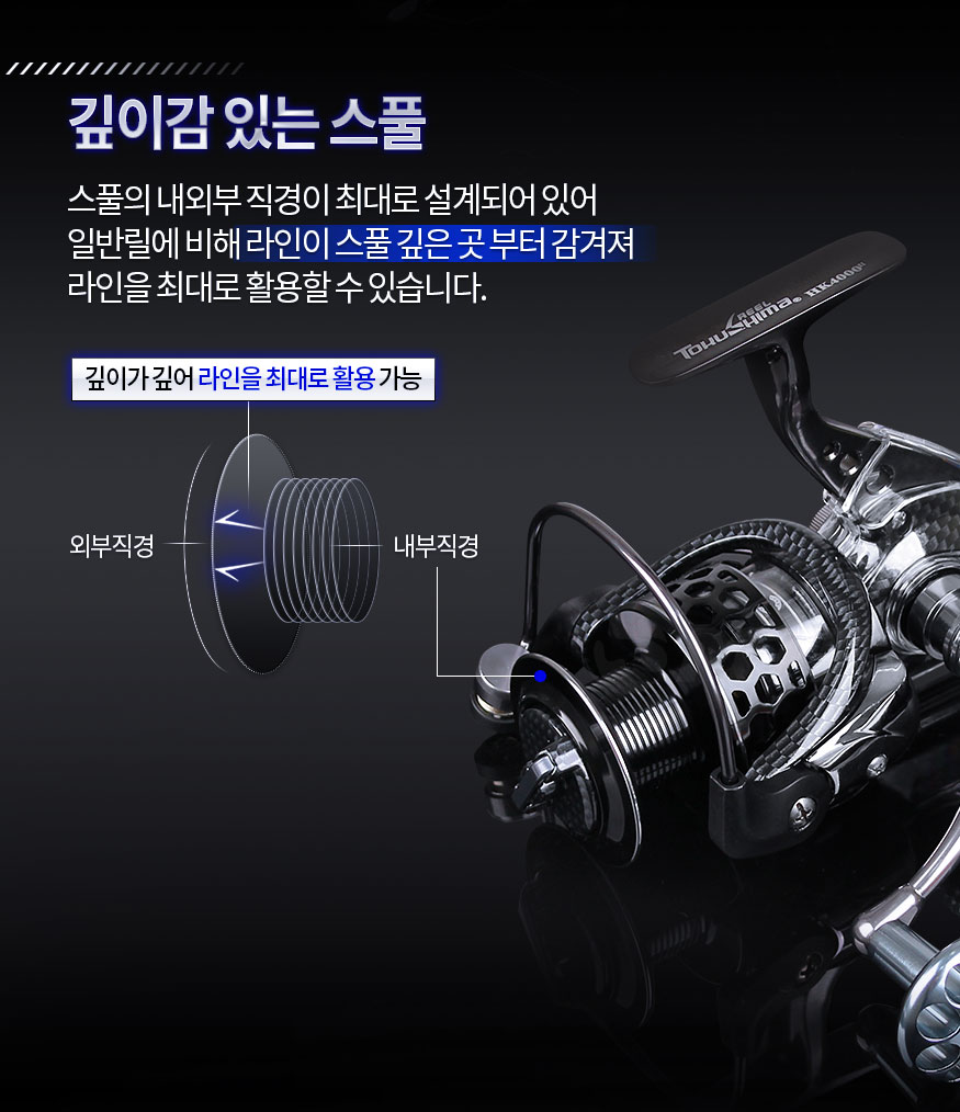 낚시도중 줄풀림으로 얼마나 고생이 많으셨나요.-->평행권사로 골고루 감기는 첨단 기능으로 줄꼬임 방지 기능으로 한층더 낚시에 몰두하게 될것입니다.