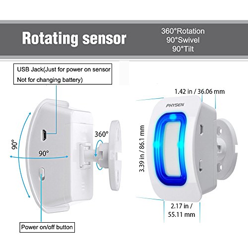 - Working Principle- Our sensor uses PIR to detect any movement within the detection zone(16.4ft range x 110°). Perfect for long or hidden driveways to allow you just a little extra warning before guests arrive.Dimension: Receiver: 80 x 80 x 30mm or 3.14 x 3.14 x 1.15in; Sensor: 86 x 55 x 36mm or 3.39 x 2.17 x 1.42in