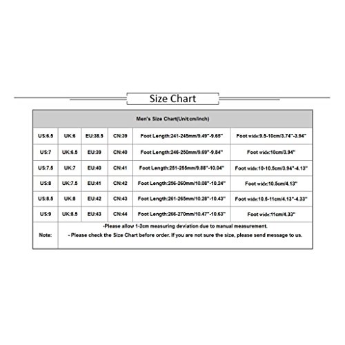 ?:Men's Size Chart(Unit:cm/inch) ?:US:6.5===CN:39===Foot Length:241-245mm/9.49"-9.65"===Foot wide:9.5-10cm/3.74"-3.94" ?:US:7 ===CN:40===Foot Length:246-250mm/9.69"-9.84"===Foot wide:10cm/3.94" ?:US:7.5===CN:41===Foot Length:251-255mm/9.88"-10.04"===Foot wide:10-10.5cm/3.94"-4.13" ?:US:8===CN:42===Foot Length:256-260mm/10.08"-10.24"===Foot wide:10.5cm/4.13" ?:US:8.5===CN:43===Foot Length:261-265mm/10.28"-10.43"===Foot wide:10.5-11cm/4.13"-4.33" ?:US:9===CN:44===Foot Length:266-270mm/10.47"-10.63"===Foot wide:11cm/4.33" ?:Feature: ?:Gender: Men ?:Material:Mesh ?:Sole Material:Rubber ?:Style: Fashion,Casual ?:Item Type: Sport Shoes ?:Heel Type: Flat with ?:Toe Shape: Round Toe ?:Appropriate Season: Spring,Autumn ?:Occasion: Outdoor ?:Package: 1 Pair Men Shoes ?:Note: ?: ?:Due to lighting effects, monitor's brightness/contrast settings etc,there could be some slight differences in the color tone of the pictures and the actual item ?:If you have problem of the item, please contact us we will do our best to resolve the problem for you ?:We suggest you choose a larger size, if your actual feet length is longer than the?above?feet length 0