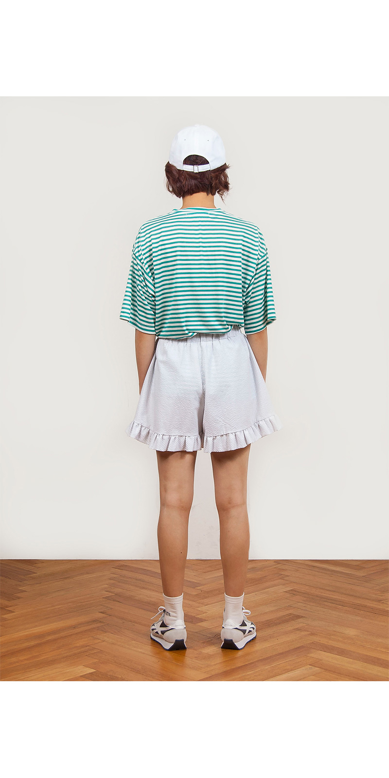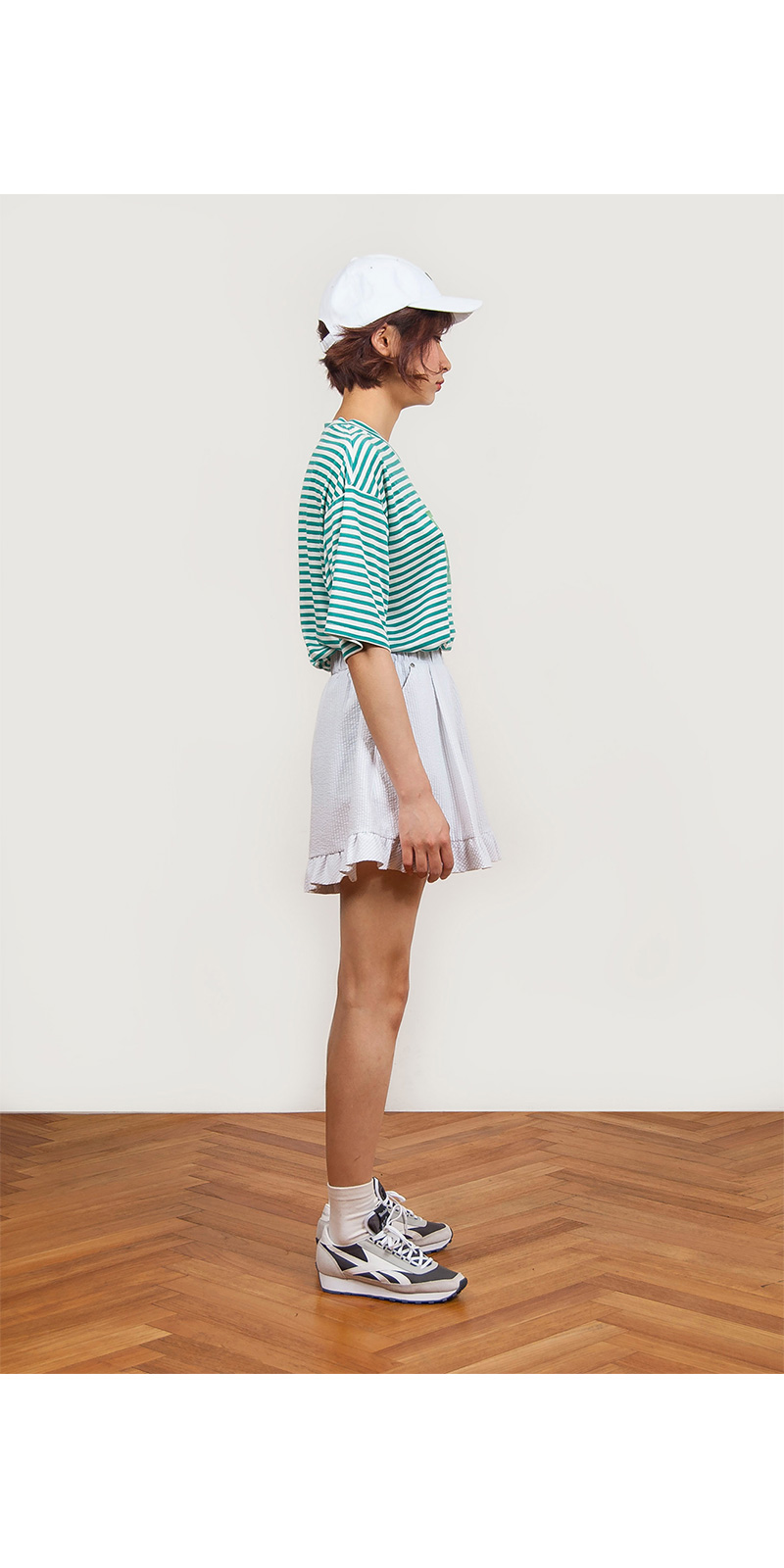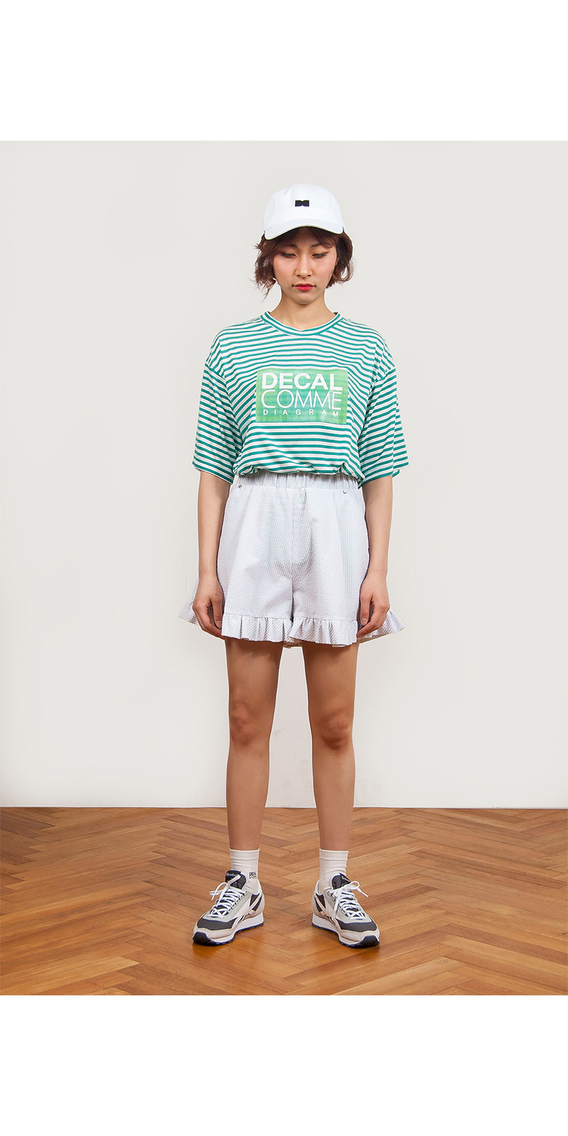 어깨가 살짝 드롭되는 라인의 품감이 100이 조금 넘는 사이즈의 티셔츠 입니다.스트라이프의 베이스 원단에 브랜드 로고가 프린트 되어져 있으며,하의에 넣어서 연출하거나 빼내어 연출할 수 있도록 총장을 70cm 엉덩이를 살짝덥는 기장으로 디자인 하였습니다.