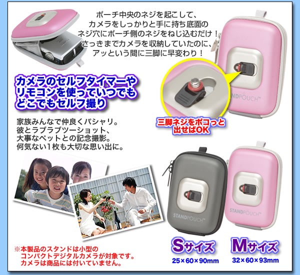 カメラを収納するケースに三脚ネジが付いた何とも画期的なポーチが誕生しました!何気ないショットや旅先でも、誰かに撮ってもらう手間もなく思い出を沢山残すことができます。 ※サプライヤー直送品【商品名】スタンドポーチM E-1733 ダークグレー