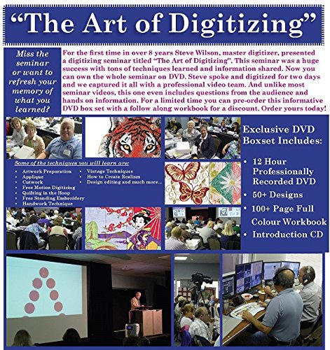 ★ Couldn’t make it to one Steve Wilson’s Digitizing seminars? No worries, we have the DVD Box Set available for purchase. This 12 hour DVD is professionally recorded from the live event in May 2013. The video shows Steve teaching digitizing techniques on Floriani software, however, it is not specific to Floriani software. He taught the class on digitizing, for any software and any level! The DVD set also includes a full color workbook, so you can follow along and practice.