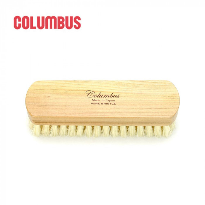 靴のお手入れに欠かせないツヤ出し用ブラシです。 製造国:日本 素材・材質:豚毛 商品サイズ:持ち手部分サイズ:約17cm×約5cm、毛足長:約2.3cm ※サプライヤー直送品 ご注文後3~4営業日後の出荷となります【商品名】コロンブス シューケア 靴用ブラシ 豚毛ブラシ(ツヤ出し用)