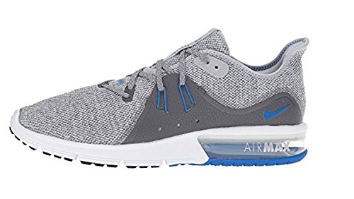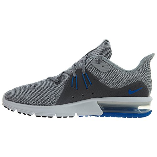 -. Binding : Apparel -. Brand : -. Color : (Dark Grey/Soar-wolf Grey-glacier Blue -. Department : mens -. Feature : Dynamic Fit technology delivers a one-to-one fit. / Engineered mesh upper offers lightweight ventilation. / Zoom Air units provide responsive cushioning. / Partial mesh bootie wraps the foot for a plush, comfortable fit. Notches at the tongue provide easy on and off. / Fitsole sockliner conforms to the shape of your foot to provide comfort and underfoot support. -. ProductGroup : Shoes -. ProductTypeName : SHOES -. Size : 9.5 D(M) US -. Title : Men's Air Max Sequent 3 Running Shoe