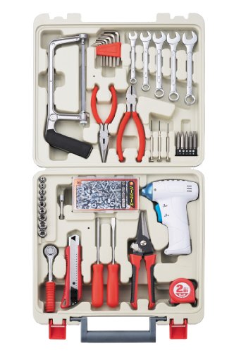 -. Feature : 製造国:中国 / 付属品・セット内容:アルミフレームハクソー(替刃x1枚)、ラジオペンチ150mm、ニッパー150mm、カッターL、スニップス、6.35mm角エクステンションバー、6.35mm角ラチェットハンドル、六角棒レンチ8本組:1.5/22.5/3/4/5/5.5/6mm、 / コンビネーションレンチ:8/10/12/13/14mm、6.35mm角ソケット:4/4.5/5/6/8/9/10/11/12mm、精密ドライバー:+No.0/-1.4mm/-1.8mm、ドライバー:+No.2/-6mm、メジャー2m、パーツケース、乾電池式ミニドライバー、ビットセット:+No.1x+2/-4mm/-6mm / 乾電池式ミニドライバー仕様:モーター電圧DC6V、回転数約210min-1、最大トルク数約3.0N-m、電源:単三乾電池4本、質量約240g(本体のみ) / 乾電池式ミニドライバー能力/ネジ締め:木ネジ最大Φ3.1mm(2x4材)、穴あけ:木工ドリル刃最大Φ3mm(2x4材)