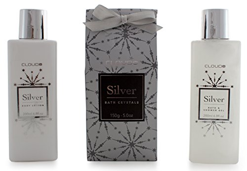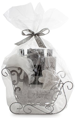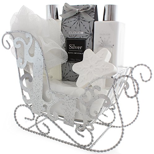 - The gift set includes 6.8 fl.oz (200 ml) shower gel, 6.8 fl.oz (200 ml) body lotion, 5 oz (150 g) bath salts, a bath fizzer 1.5 oz. (45g), an exfoliating sponge made of nylon and a silver-colored sled made of aluminum.
