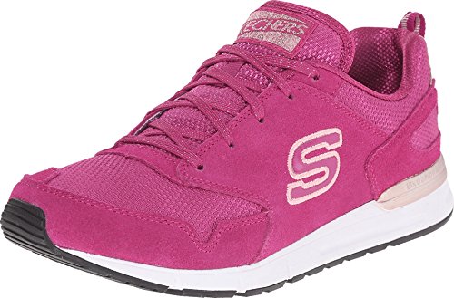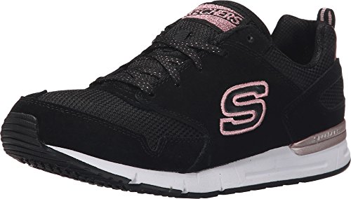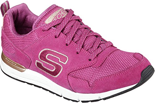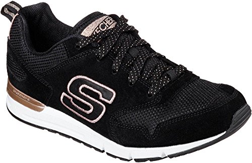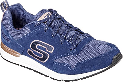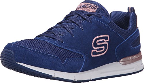 Skechers Women's OG 92 Goldie Fashion Sneaker features a soft suede and mesh fabric upper with metallic overlays in a lace up classic jogger sneaker with stitching and overlay accents. Air Cooled Memory Foam insole. Tone on tone matching color mesh fabric panels. Metallic synthetic overlay detail on heel panel and midsole. Lace up vintage style sporty casual jogging sneaker design. Stitching accents. Suede overlays at toe sides and heel. Side S logo. Mesh fabric panels for cooling effect. Heel fabric stripe with pull on top loop. Lace up front. Padded collar and tongue. Soft fabric shoe lining. Air Cooled Memory Foam cushioned comfort insole. Shock absorbing lightweight midsole. Sculpted heel stabilizing panel. Flexible rubber traction outsole.