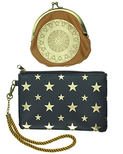 Includes a Blue and Silver Starred Zippered Pouch with Detachable Lasso of Truth Wristlet, and a Kiss Lock Coin Pouch with Wonder Woman Themed Details.