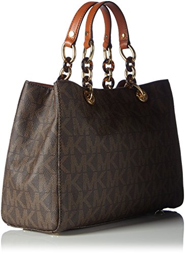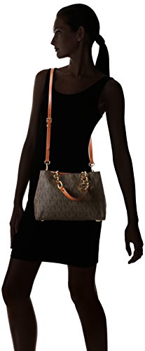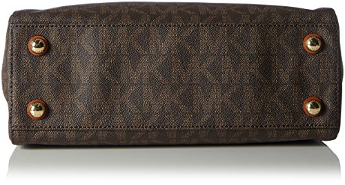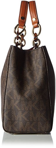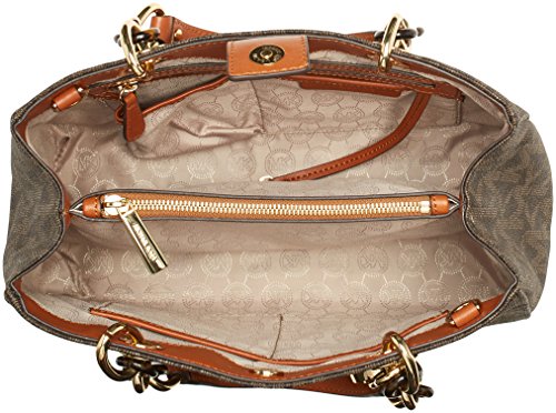An authentic Michael Kors satchel handbag styled in brown pvc and tan leather trim with gold-tone hardware. This Michael Kors handbag features logo fabric interior lining, a top open pocket, 1 center zip pocket, 1 interior zipper pocket, 4 interior slip pockets, two leather handles on a chain with 5 1/2" drop and a brown leather shoulder strap with 21" drop. Dimensions: 9.25"H x 12.5"W x 5"D