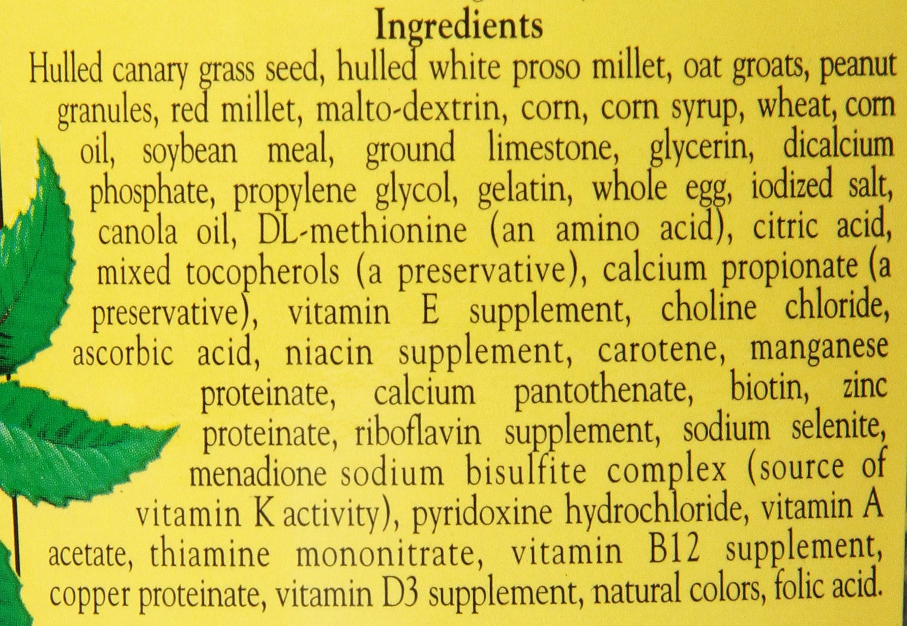 Shellless canary pear, White millet without shell, Split oats, Peanut granules, Maltodextrin, Red millet, Ground corn, Soybean meal, Corn syrup wheat flour, Powdered limestone, Corn oil, Glycerin, Dicalcium phosphate, Propylene glycol,
